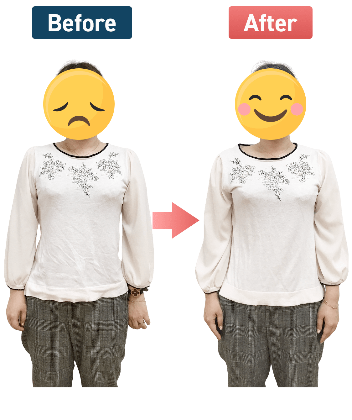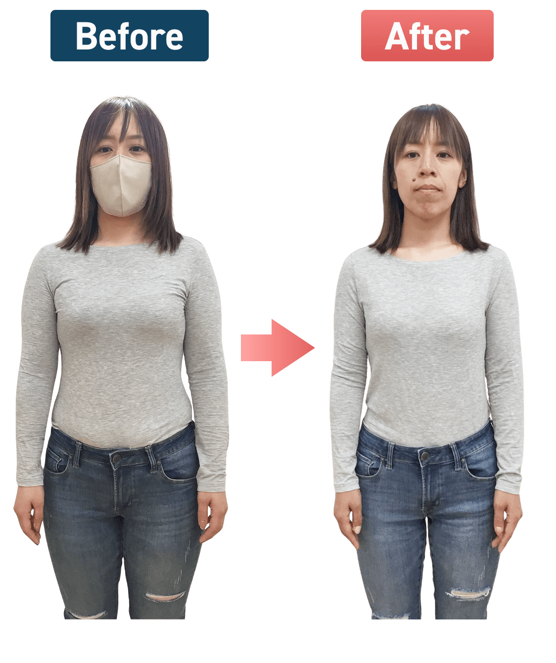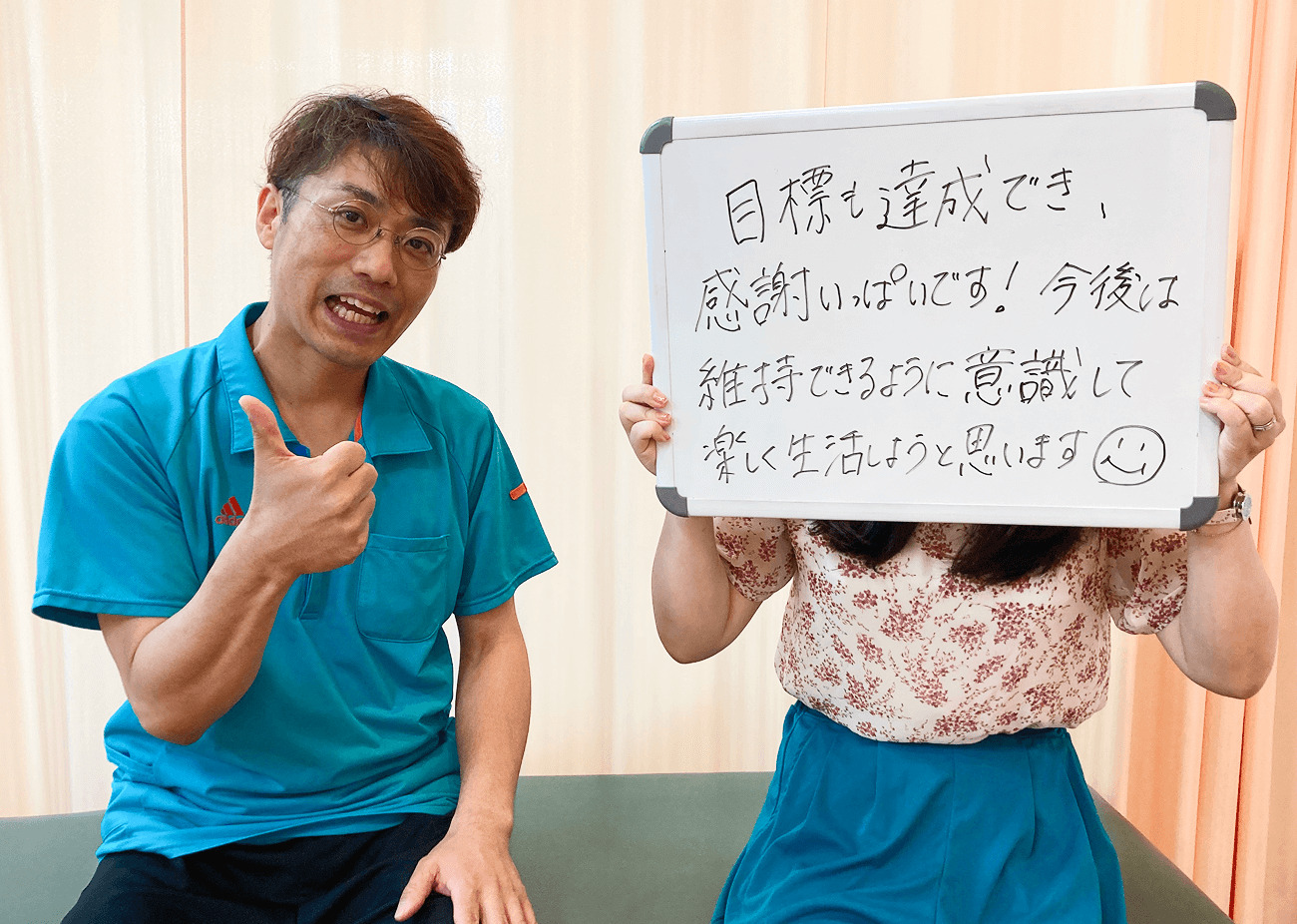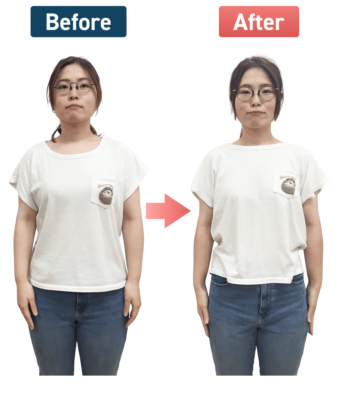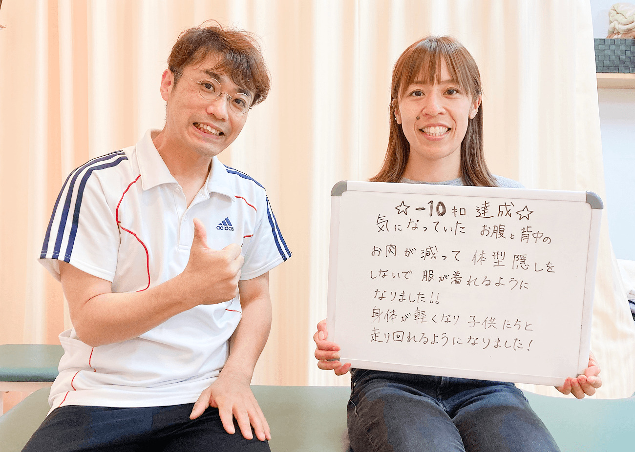 3ヶ月で10.5kg痩せてウエストや太もも周りもゆるくなり、着たい服を選べるようになったとお喜びのMMさま