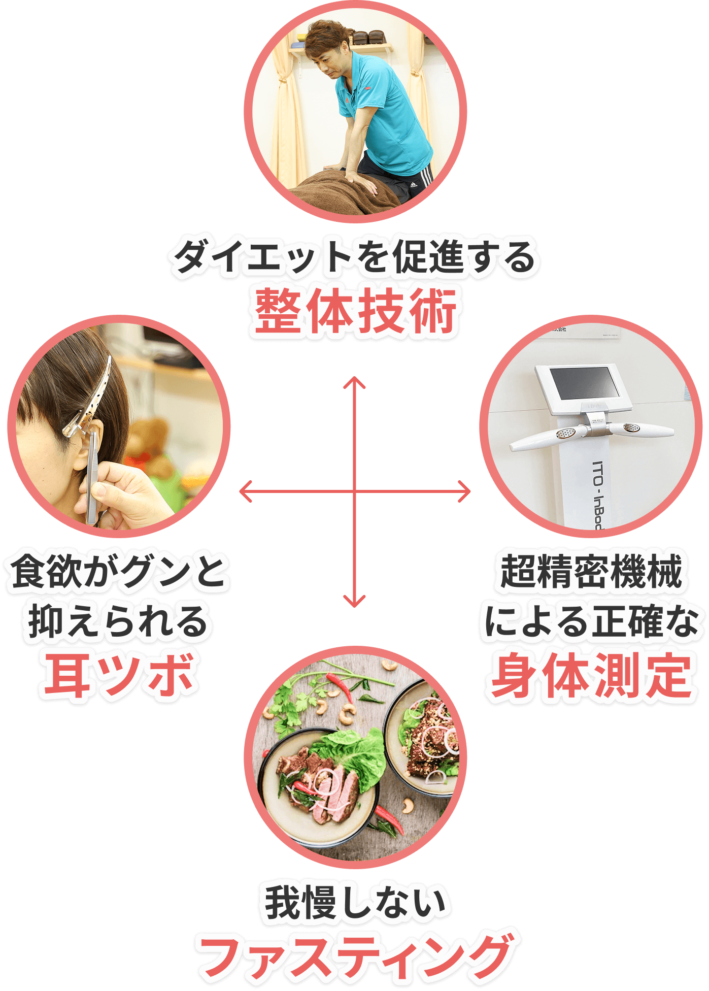 ただ痩せるだけじゃなく、身体の不調(自律神経の乱れ、全体の硬さやコリなど)も整えながら、痩せつつ、健康に美しくなれるよう、やさしい整体施術も織り交ぜていきます。